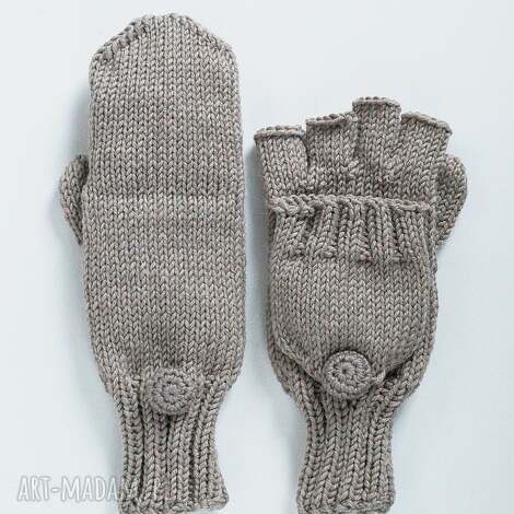 Autorskie wełniane rękawiczki flap merino beżowe - Damskie bezszwowe rękawiczki z klapką zapinaną na guzik - wykonane ręcznie na drutachsprzedane
