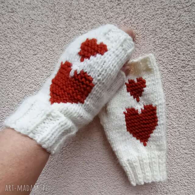 handmade mitenki w serca/rękawiczki bez palców/ walentynki/ kremowe mitenki w rude
