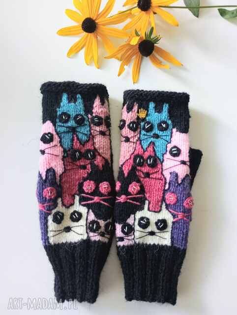 ręcznie zrobione mitenki z serii szalone koty/ rękawiczki damskie/ mitenki jesienne